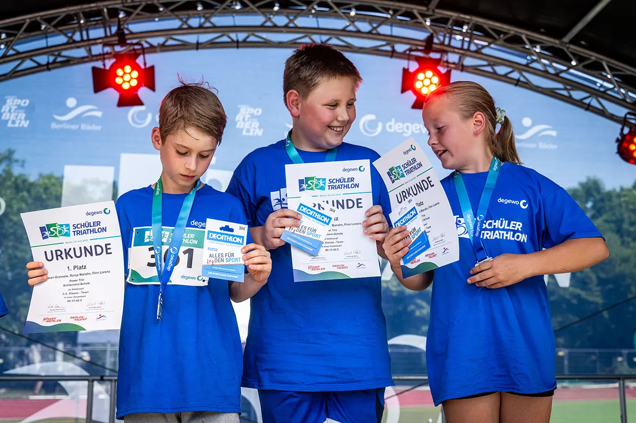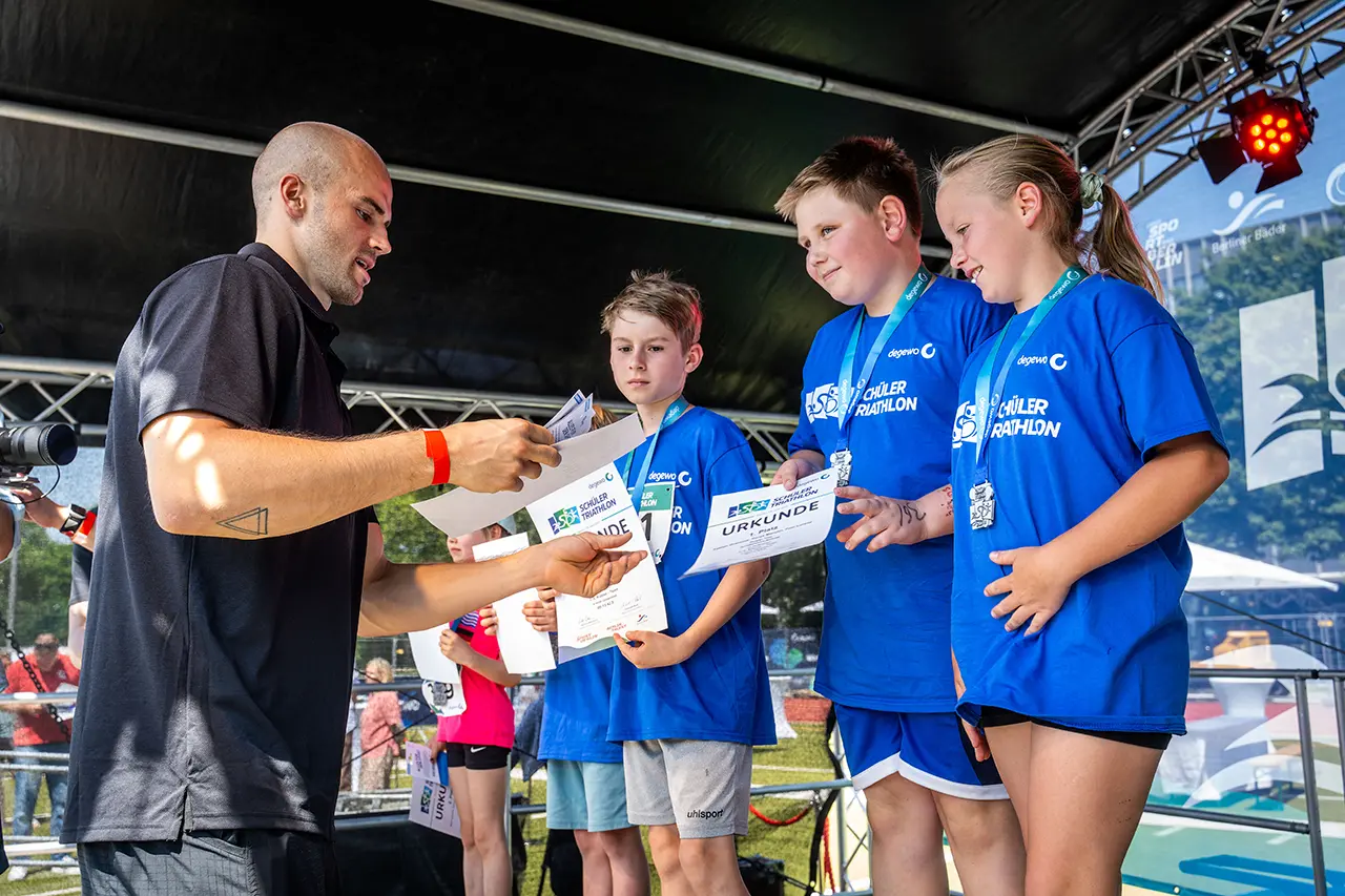 Alle Teilnehmenden erhalten ein T-Shirt und eine Startnummer. Diese sollte im besten Fall den ganzen Tag über sichtbar getragen werden (Ausnahme beim Schwimmen). Im Ziel erhalten alle Teilnehmenden eine Medaille.
