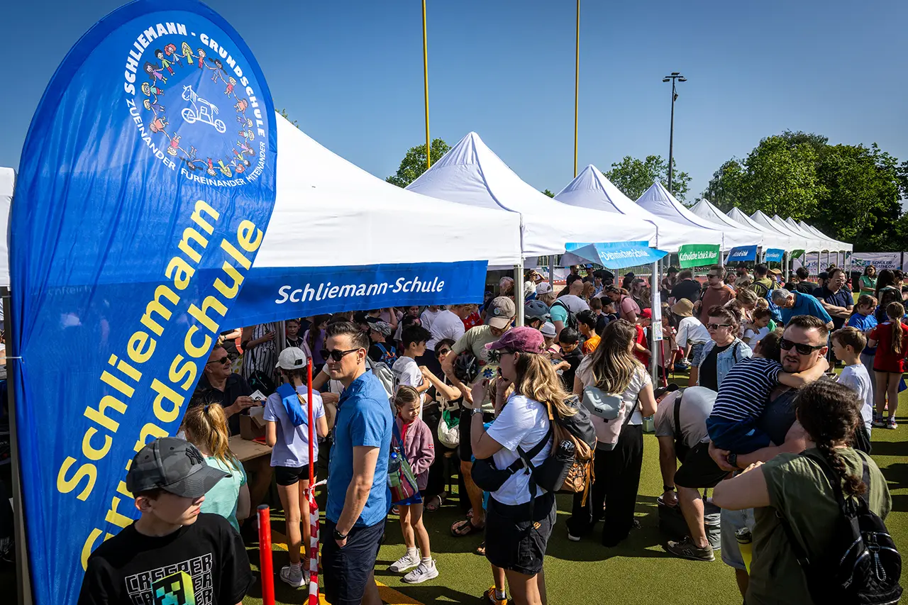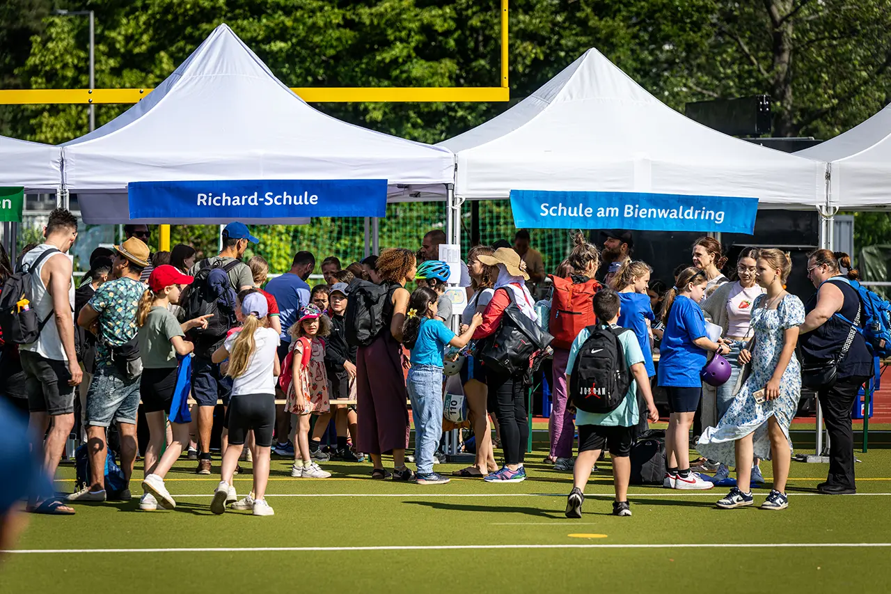 Beim degewo-Schülertriathlon könnt ihr eure Schule mit einem eigenen Stand präsentieren – als kreativer Treffpunkt und Sammelpunkt für eure Schule. Der Stand wird von uns gestellt, die Gestaltung liegt ganz bei euch.